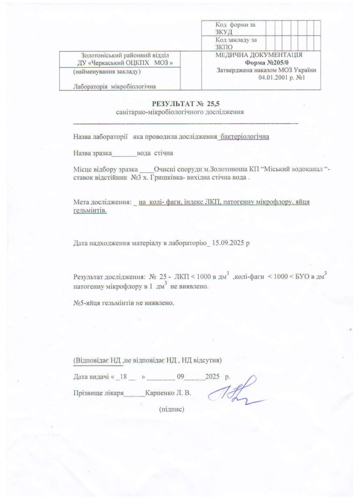 Результат дослідження стічної води на очисних спорудах Золотоноші
